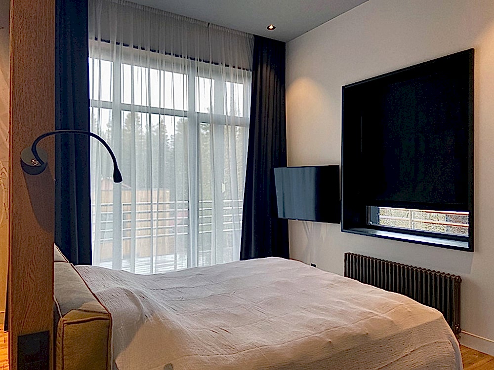 Температура внутри дома поддерживается автоматически в течение всего года, вне зависимости от сезона и температуры на улице, что очень удобно при такой площади. Дополнительно на стены установлены пульты от кондиционеров, хотя мы рекомендовали Pin-Up не делать...