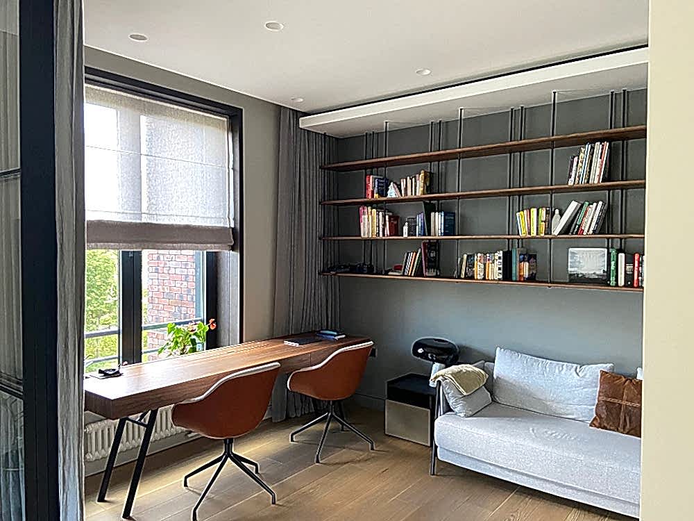Система позволяет управлять практически всем, что есть в квартире от освещения до системы мультирум на оборудовании Sonos. Благодаря внедрению сценарного освещения стены в Pin-Up лишены рядов выключателей, а групп света в целом немало, к тому же многие из них диммируются по Dali.